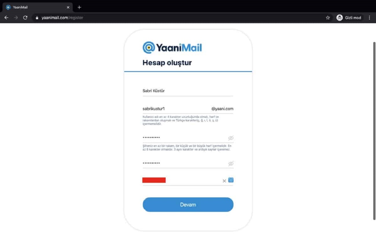 YaaaniMail hesap açma için gireceğiniz URL bağlantısı yaanimail.com