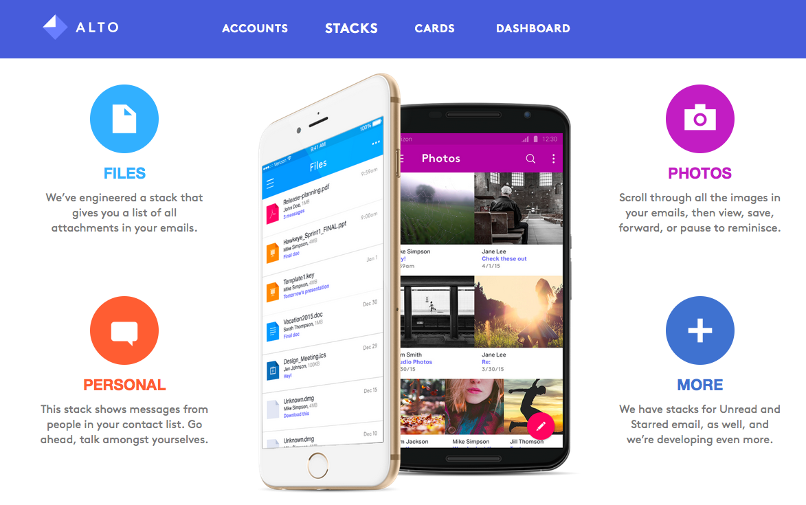 Kullanıcılar yine Google Inbox'ta olduğu gibi tanıtım, seyahat, alışveriş, finans ile ilgili kategorilerdeki bilgileri bir arada görüntülemenizi sağlıyor. Ayrıca Alto'da arama filtreleme seçeneklerinin yanı sıra fotoğraf eklerini de doğrudan görüntüleyebilmeniz mümkün.