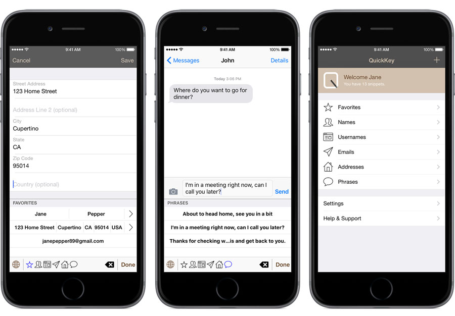 Örneğin Facebook, Twitter, Google+ gibi servisler e-mail ve şifre ile girişi kabul ediyorlar. Sistemden sürekli çıkış yapıp tekrar girmemiz gerektiğinde bilgileri tek tek girmemiz gerekiyor. Fakat QuickKey uygulamasında kullanıcı adımızı hazır form oluşturup kaydedersek, kullanıcı adı yazmamız gerektiğinde sadece tek bir tuşa basıp kullanıcı adımızı yazmamız sağlıyor.