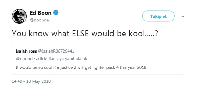 Injustice 2 oyununun hayranı olan bir oyuncu, NetherRealm stüdyosundan Ed Boon'a oyunla ilgili Twitter üzerinden bir isteğini dile getirdi. Ed Boon'dan istediği şey Fighter Pack 4 içeriğinin bu yıl çıkması yönündeydi. Bu paket, 2017 yılının sonlarına doğru, çıkacağına dair onaylanmıştı fakat ne zaman çıkacağı bilinmiyordu. Ed Boon, takipçisinin bu isteğine yanıt olarak, BAŞKA neyin hoş olacağını biliyorsun.....'' diyerek cevap verdi. IsaiahR36729441 isimli kullanıcının isteğine verilen yanıtta, görselden göreceğiniz üzere 'cool' kelimesi yerine 'kool' kullanılmış. Buradan yola çıkarak, oyunun orijinalinin Combat olduğu ve dilimizde Kombat olarak yazıldığı akıllara geldi. Ed Boon'un bu yazı şekliyle, Mortal Kombat'tan haber vermeye çalışıyor olabileceği düşünüldü.